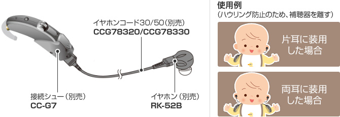 乳幼児期は主に耳かけ型補聴器を使用しますが、耳が小さく柔らかいうちは、補聴器を安定して耳にかけられないかもしれません。その場合は、耳にかけずに使用できる「イヤホンクロス」をご使用いただけます。